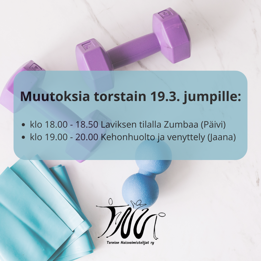 Muutama muutos viikon 12 jumpille: Torstaina 19.3. poikkeuksellisesti Zumbaa Laviksen sijasta. Tunti pidetään tuttuun aikaan klo 18 - 18.50 ja ohjaajana Päivi. Klo 19-20 Kehonhuolto ja venyttelytunnin…